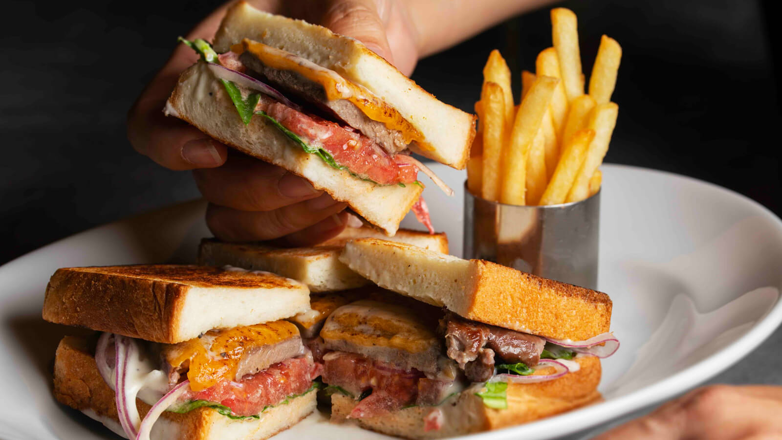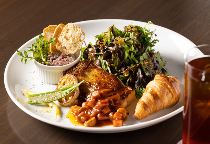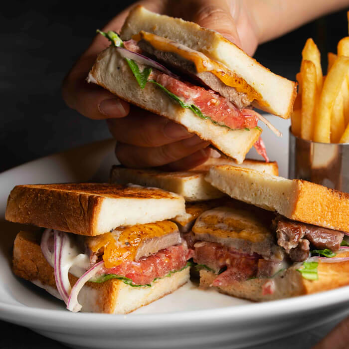 カフェメニューも充実したこちらの店舗は、定番のシーザーサラダやプレミアムビーフの鉄板ステーキ、ジューシーなハンバーガー、各種デザートなどバラエティ豊かにとり揃え、よりカジュアルに様々なオケージョンでお楽しみいただけます。